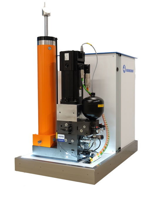 CLDP 代表 Voith 在 Rutesheim 生产的“闭环单出杆泵”,是一种带有集成泵的伺服驱动器。因此,此液压驱动器只需进行机械、电气和电子连接,即可在 3 年或 20,000 小时内免维护运行。Voith 提供完整的套件,其驱动元件采用了 Herbert Hänchen 公司的液压缸。这使得用户以及机器和设备制造商无需自己的液压技术知识即可使用高性能液压系统,并且可以在无阀系统中实现最佳效率。Voith 项目负责销售经理 Harald Branz 工程师解释说:“特别是在大力方面,液压缸明显优于主轴驱动。除了更容易处理大力之外,它的磨损也大大降低。”“通过无阀结构,可以实现无与伦比的能源效率。”但如今许多客户对液压系统望而却步,因为他们不再有自己的专家。然而,这项技术的成本效益和高力密度仍然是无与伦比的。CLDP 是一种高性能设备,客户无需任何自己的液压专业知识即可使用。