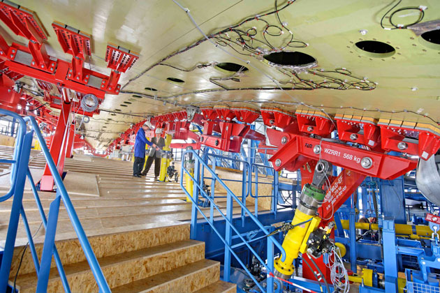 出于安全原因,通过实验验证了超过两个半的飞机寿命。为了测试材料疲劳,模拟了所有飞行阶段:包括起飞和降落,以及空中客车承受负荷变化的所有飞行阶段,即垂直和水平阵风以及飞行机动。因此,即使是良好的天气条件下的长途跨大西洋飞行也可以概括为四分之一或半小时的模拟程序。对于短程、中程和长程飞行,分别定义了一系列典型飞行,从标准飞行到极端飞行。它们由飞机机身的载荷数据以及高度剖面组成。因为机舱通过压缩机系统和两个储气罐,根据模拟的高度承受增加的内部压力,以模拟机舱和环境之间的压力差,使其与相应的飞行高度相符。从这些飞行类型中创建了一个逐次飞行程序,其中包括 1,000 多个飞行。该程序会不断重复,直到达到预定的总飞行次数。检查员的持续目视监控、对整个测试结构进行为期数天的全面检查以及对 3,600 个应变片和 80 个变形传感器的定期测量,确保及时发现出现的损坏。由于飞机采用损伤容限设计,因此在裂纹产生后,会观察其发展,直到达到临界长度。之后,将进行维修或更换部件。通过精密的监控系统,确保不会意外施加不希望的载荷,尤其是不施加过高的载荷。
